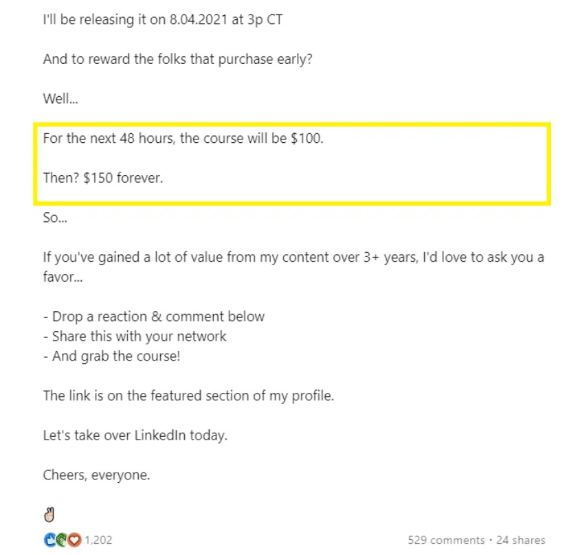 Your first post is the announcement post. This is where you talk about the benefits and outcomes, plus answer the question, “Why should someone buy this course now during my presale?”